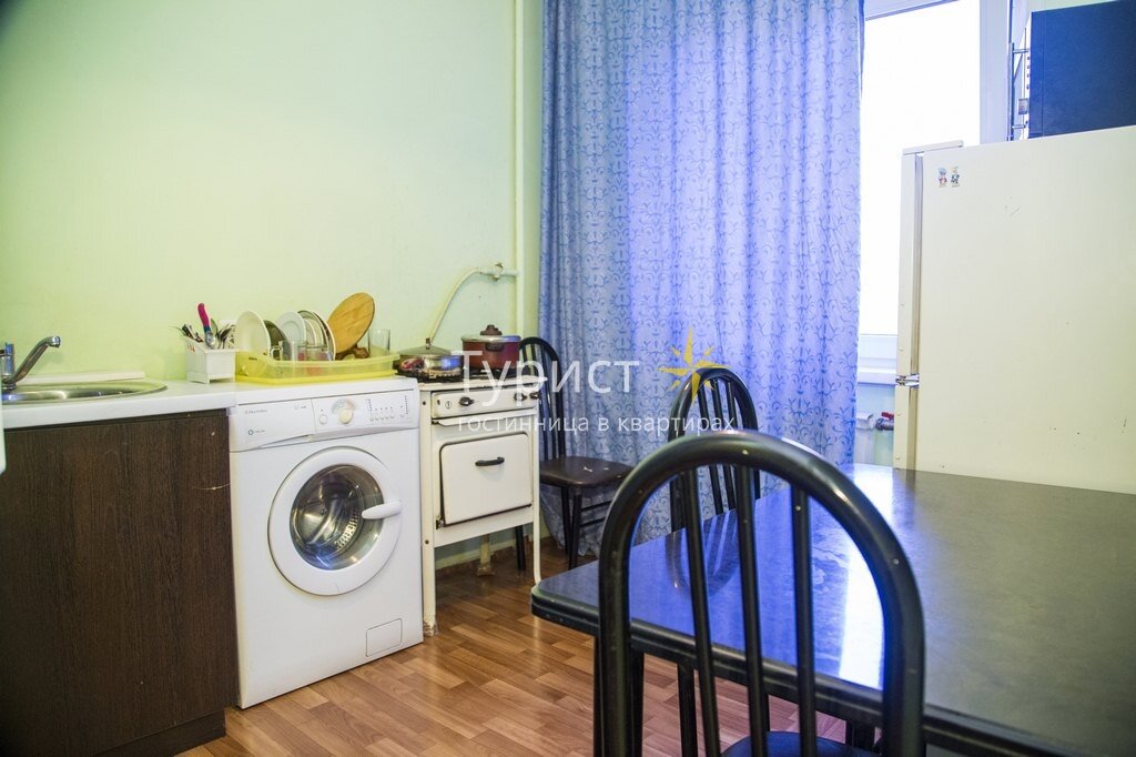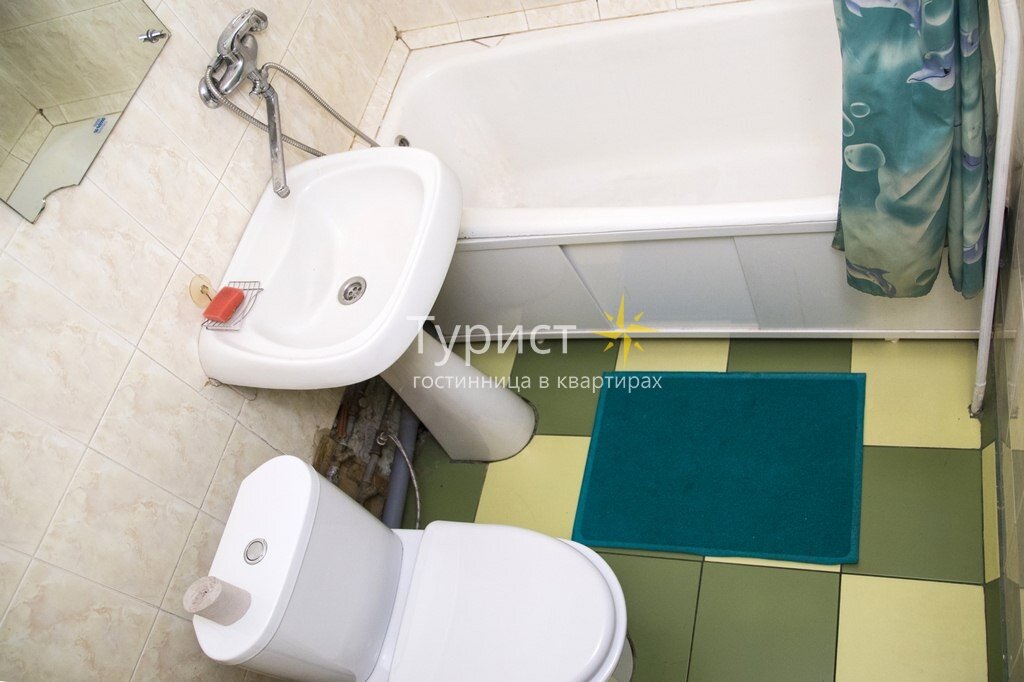 Кухонный гарнитур особенно напоминает домашний уют. Шкафчики с посудой и столовыми приборами, обеденный стол и удобные стулья, из бытовых электроприборов – холодильник, печь СВЧ и стиральная машина. Совмещенный санузел оборудован новыми приборами сантехники.